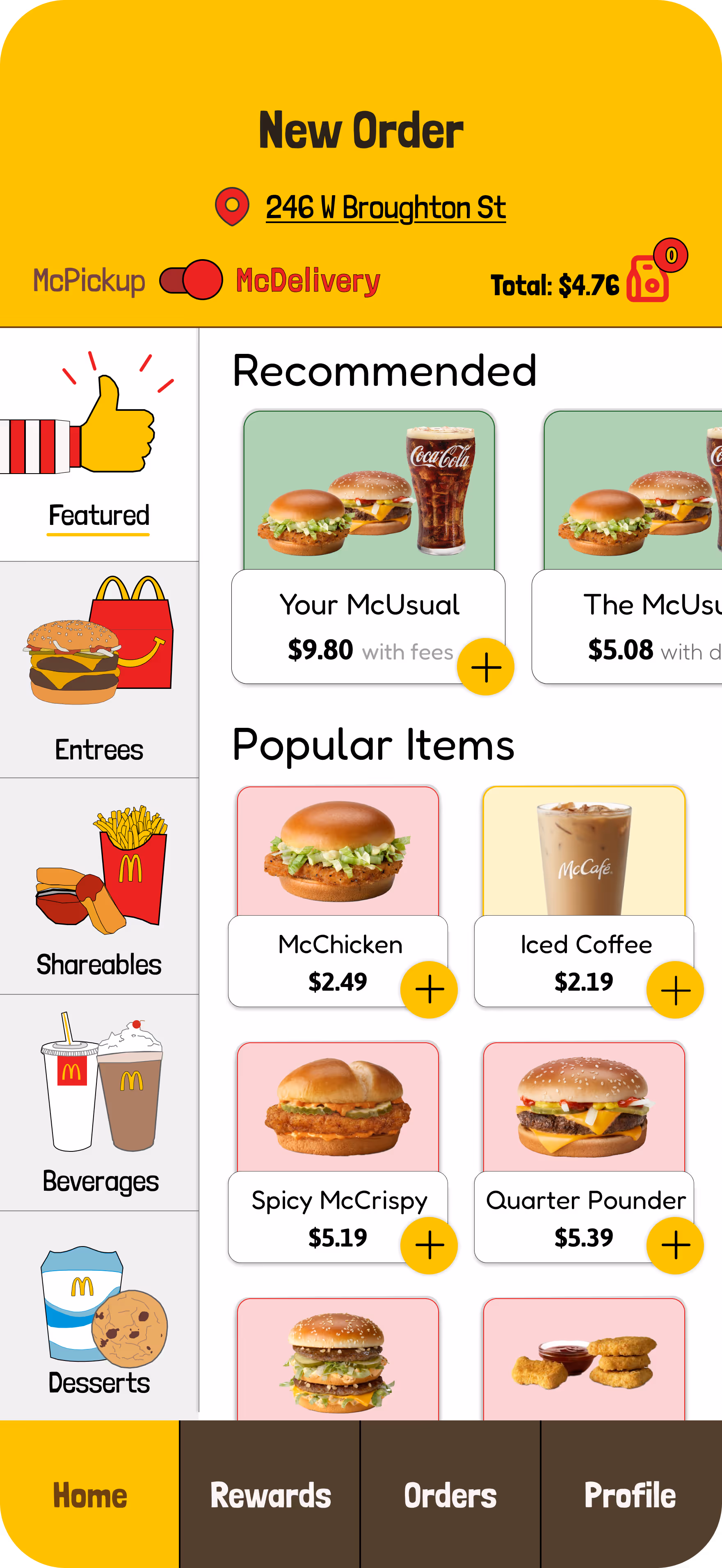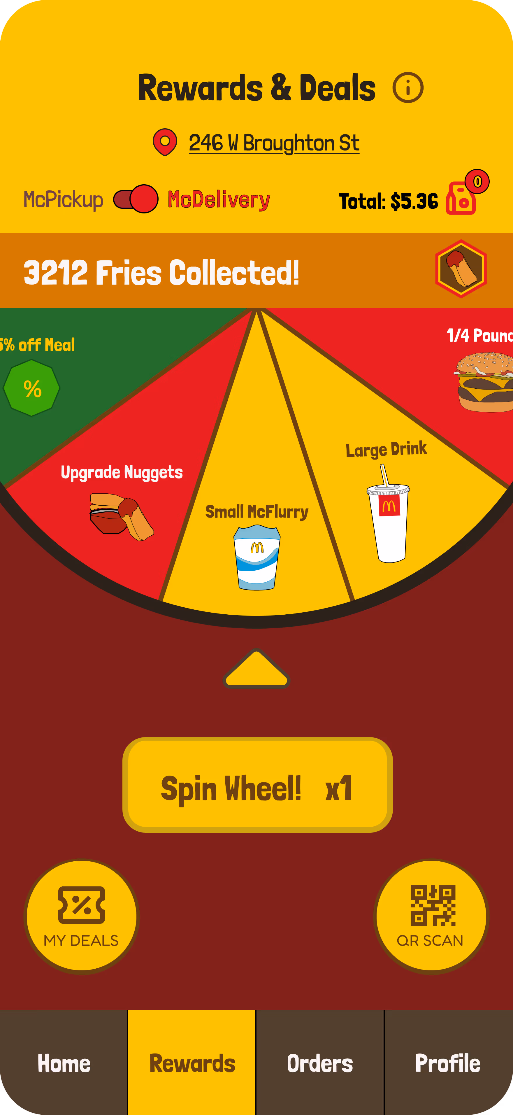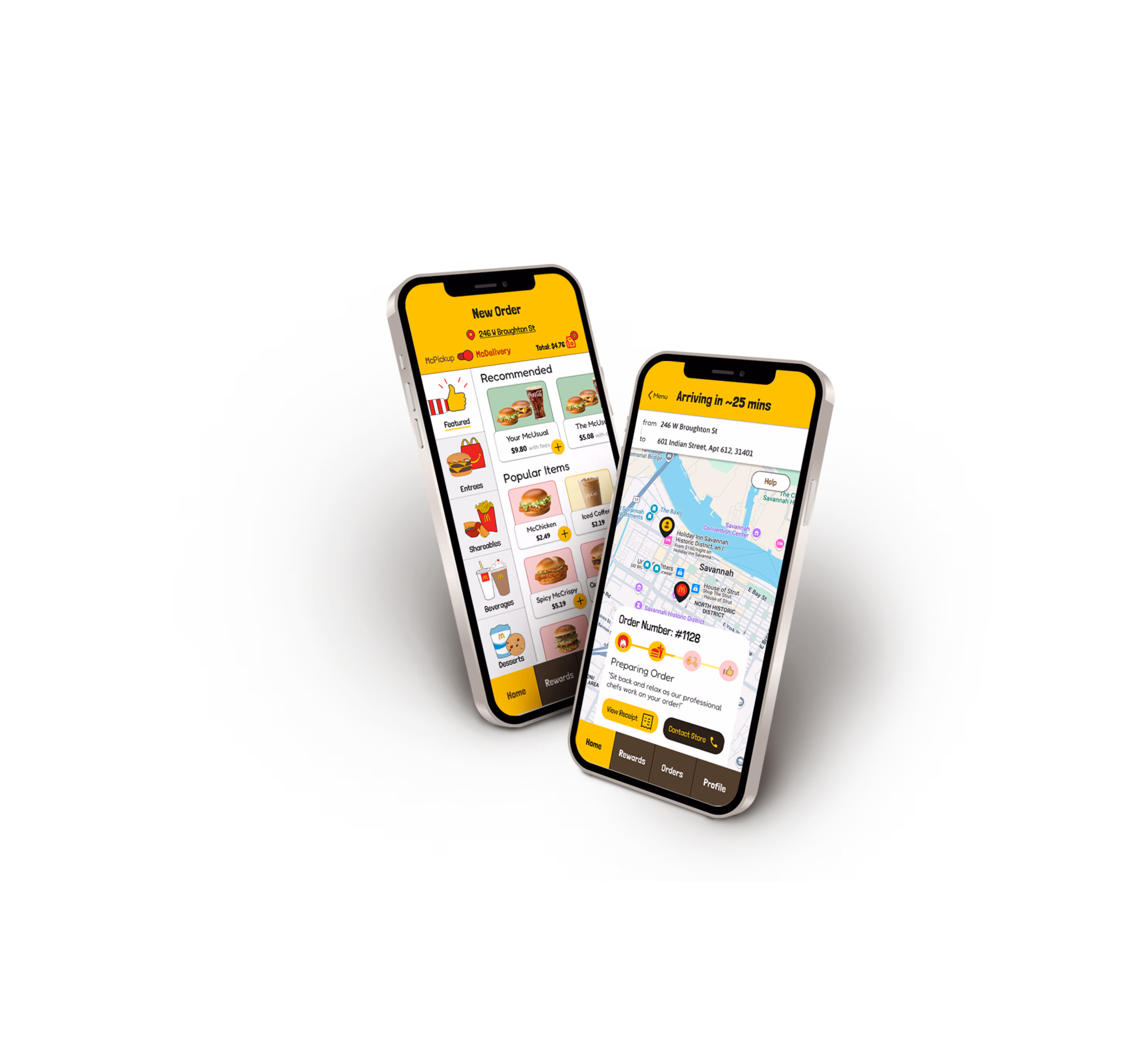 In this redesign, I transformed the McDonald’s mobile experience from a static, transactional interface into an energetic brand destination by bridging the gap between digital efficiency and the brand’s identities of fun, affordability, and speed. By synthesizing research into user "pains" like reward fatigue and menu complexity, I engineered a solution that balances high-speed functionality with strategic delight. The core of the redesign features a streamlined 5-step ordering flow, a color-coded reward system for instant recognition, and a gamified "Rewards Roulette" that personalizes deals based on user's ordering behavior. By layering bold typography and micro-animations over a high-contrast grid system, I created an interface that doesn't just look like McDonald’s, but acts like it: instantly recognizable, intuitive, and designed to turn a routine purchase into a memorable brand experience.