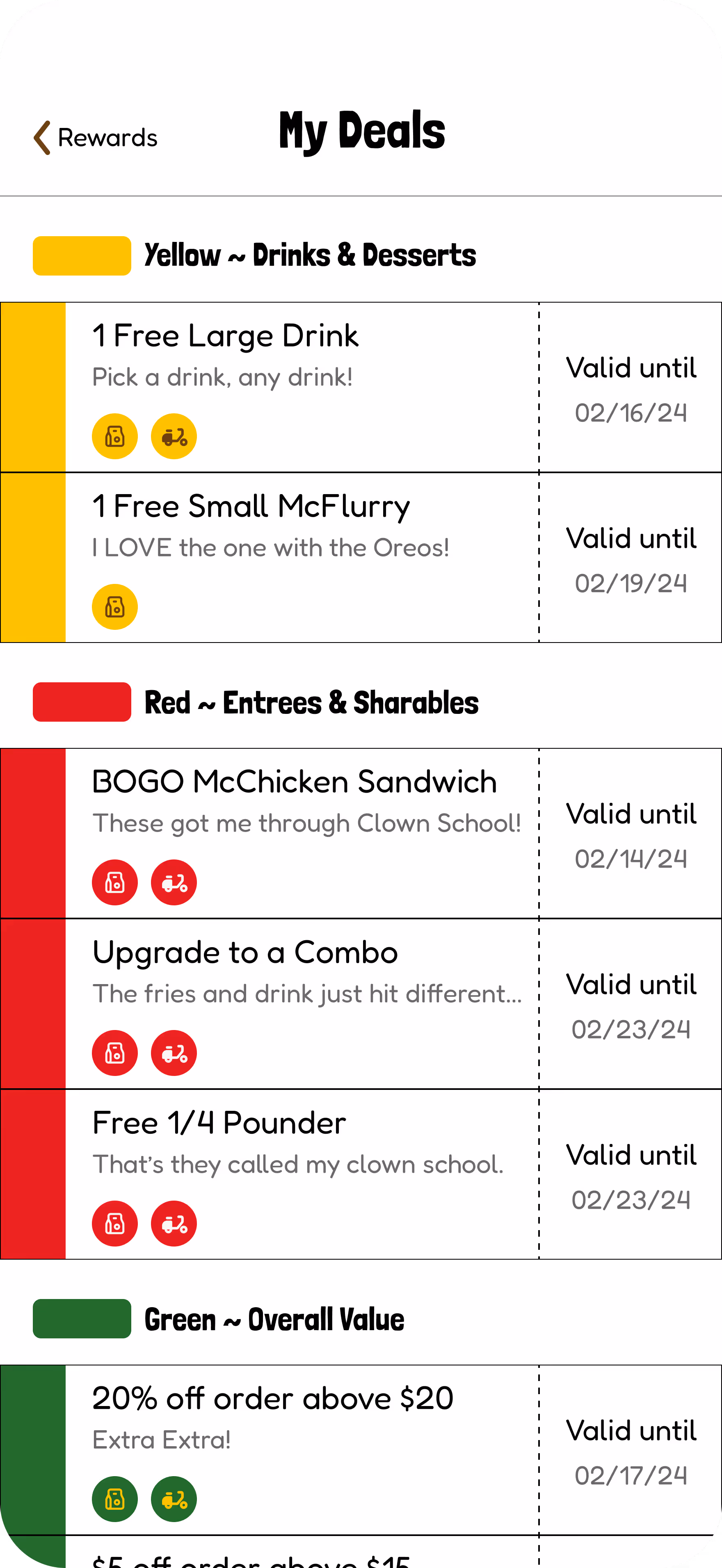 Coupons are organized into three color-coded categories: Red (Entrees/Sides), Yellow (Drinks/Treats), and Green (General). This visual system enables users to instantly pick the right coupon.