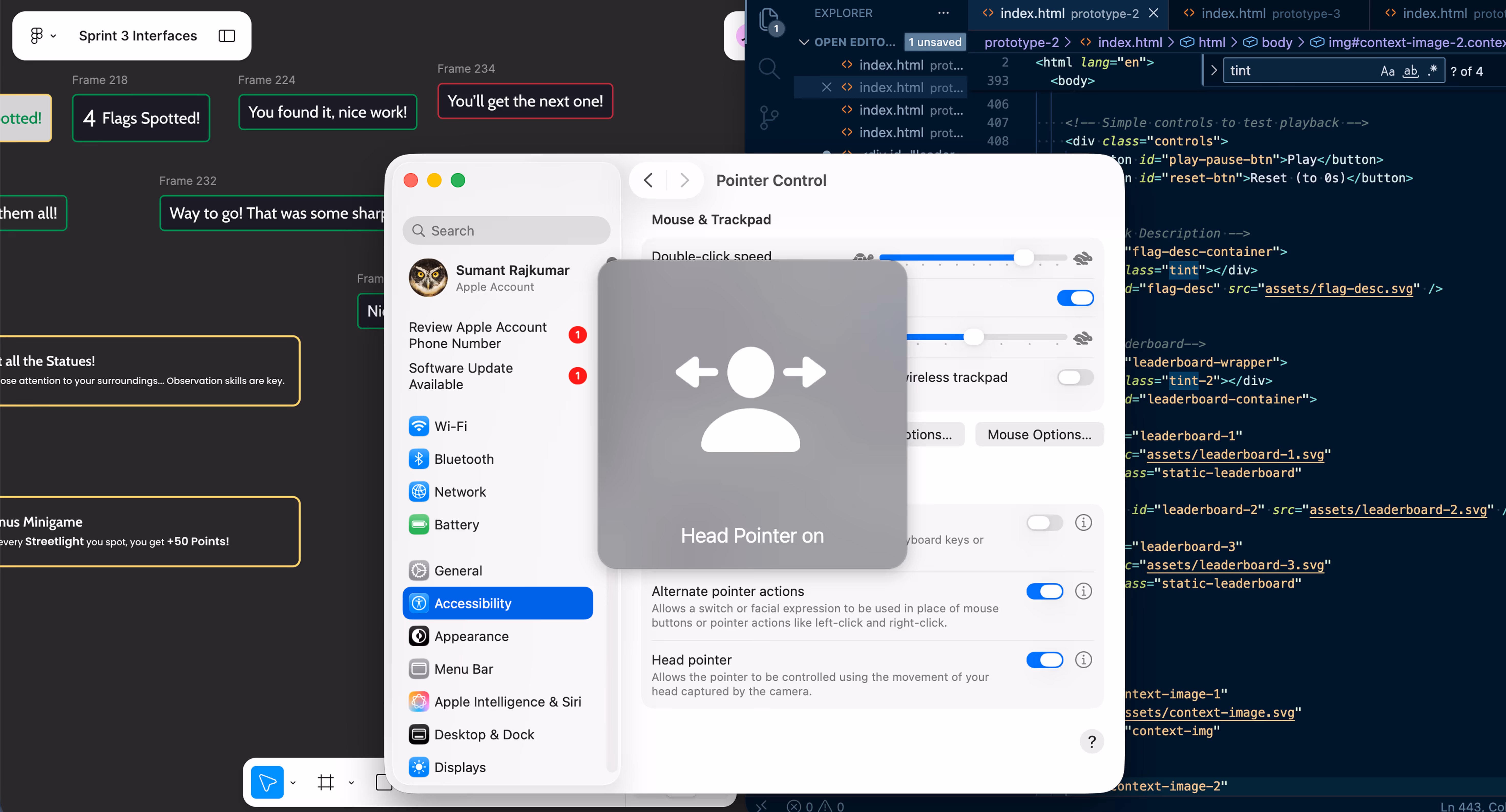 For accelerated concept validation, I engineered a functionally accurate prototype within a single week using HTML/CSS/JS. I resourcefully leveraged Mac OS's native head and eyebrow tracking to simulate the necessary eye and gesture inputs, successfully validating the core interactive experience for immediate user testing.